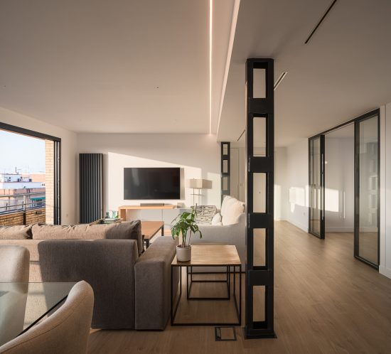 Vivienda en la Borbolla Reforma integral e interiorismo de vivivienda en Avenida de La Borbolla, Sevilla. La zona de día se organiza como un espacio diáfano, en el que comedor, salón y cocina participan del mismo espacio, circulación y vistas verdes y cruzadas. Con una terraza a suroeste